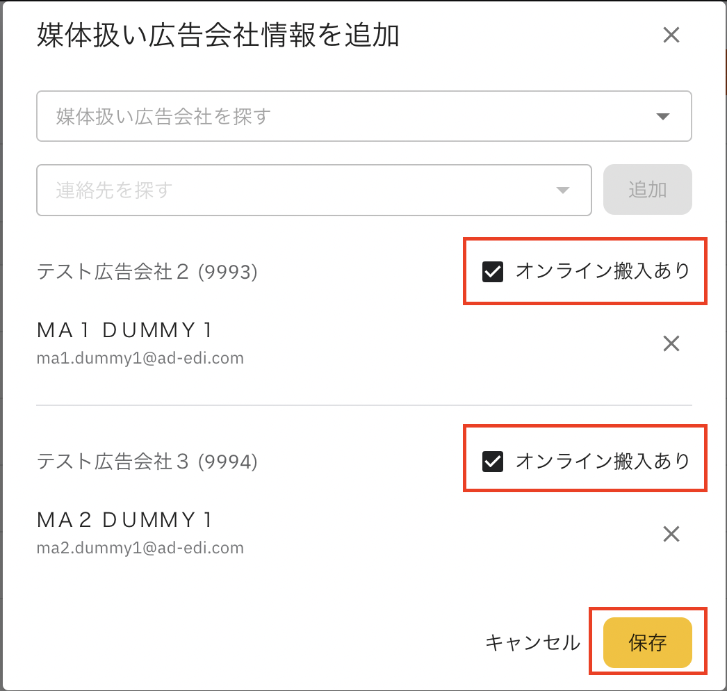 4. Wenn es Vertreter anderer Medienwerbefirmen gibt, wiederholen Sie den Vorgang aus Schritt 3. Wenn alle Vertreter eingegeben sind, setzen Sie ein Häkchen bei „Online-Anlieferung vorhanden“ und klicken Sie auf „Speichern“.