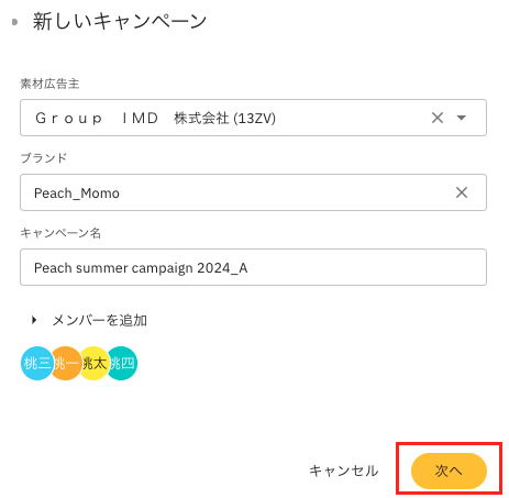 - Geben Sie den „Inserenten“, die „Marke“ und den „Kampagnennamen“ ein.