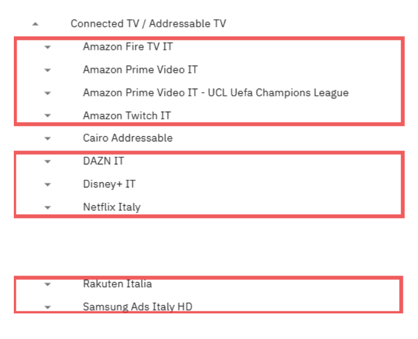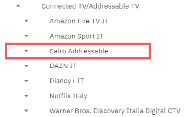 Los canales de televisión lineales principales en Italia también tienen TV direccionable, pero no todos ellos tienen un destino direccionable disponible en Cape Advanced TV. Ten en cuenta que en los planes de medios, TV direccionable se indica como "CTV" o "Addressable". A menudo, el contenido lineal y de televisión se envía al mismo destino.