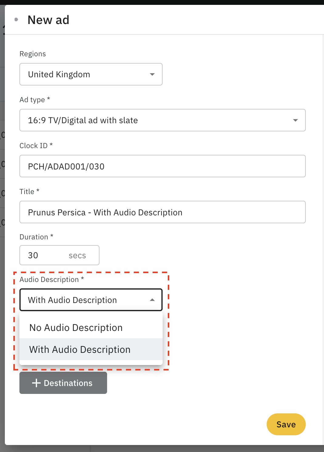 - En el formulario del anuncio, selecciona With Audio Description en el desplegable de Audio Description.