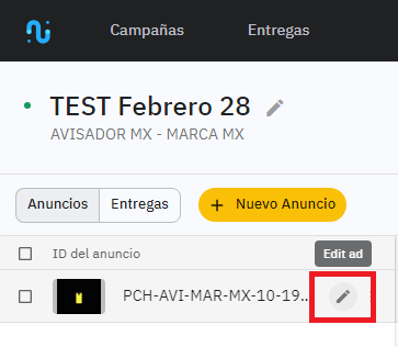Le code fourni par le support doit être saisi avant livraison, dans le formulaire de création de la publicité, dans le champ Code Televisa (Codigo Televisa).
