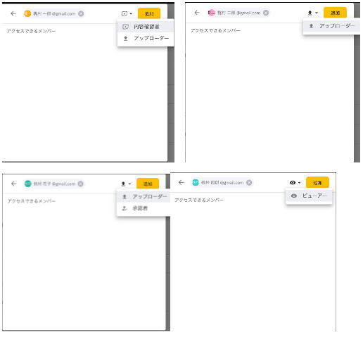 Ruolo del collaboratore: "Approver", "Visitatore", "Approver dell'upload", "Uploader", "Editor" o più di uno
