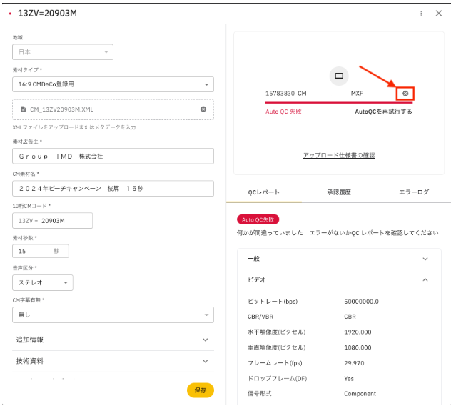 Dopo aver esaminato il report del controllo qualità automatico (Auto QC), clicca su ✖️ a destra del nome del file se desideri eliminarlo così com'è.