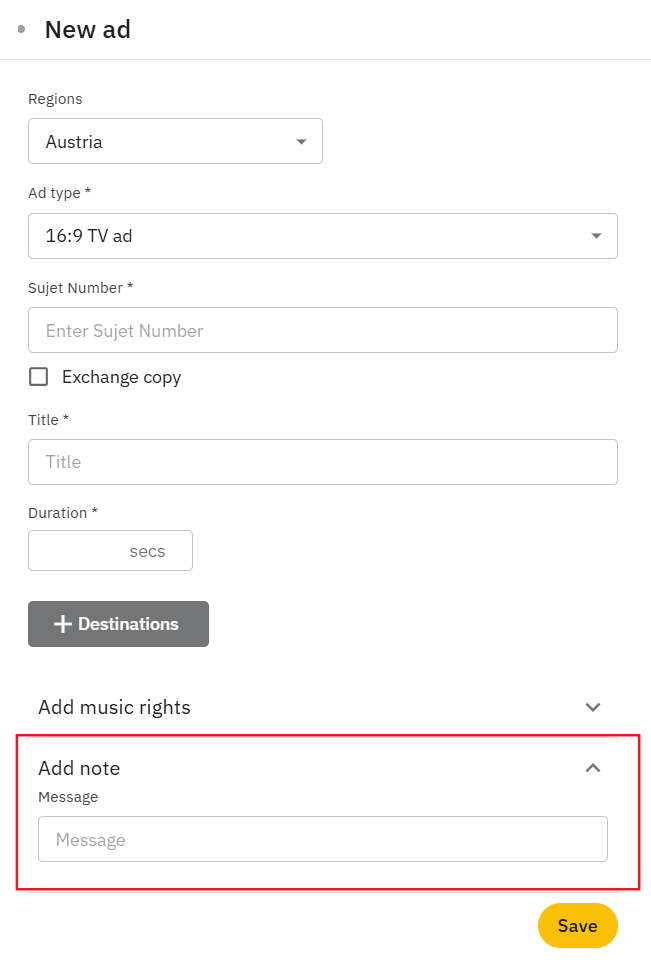 Quando si creano gli spot nella campagna, si prega di aggiungere i numeri di agenzia e di prodotto ORF nella sezione delle note del modulo Nuovo Spot su Cape Advanced TV: