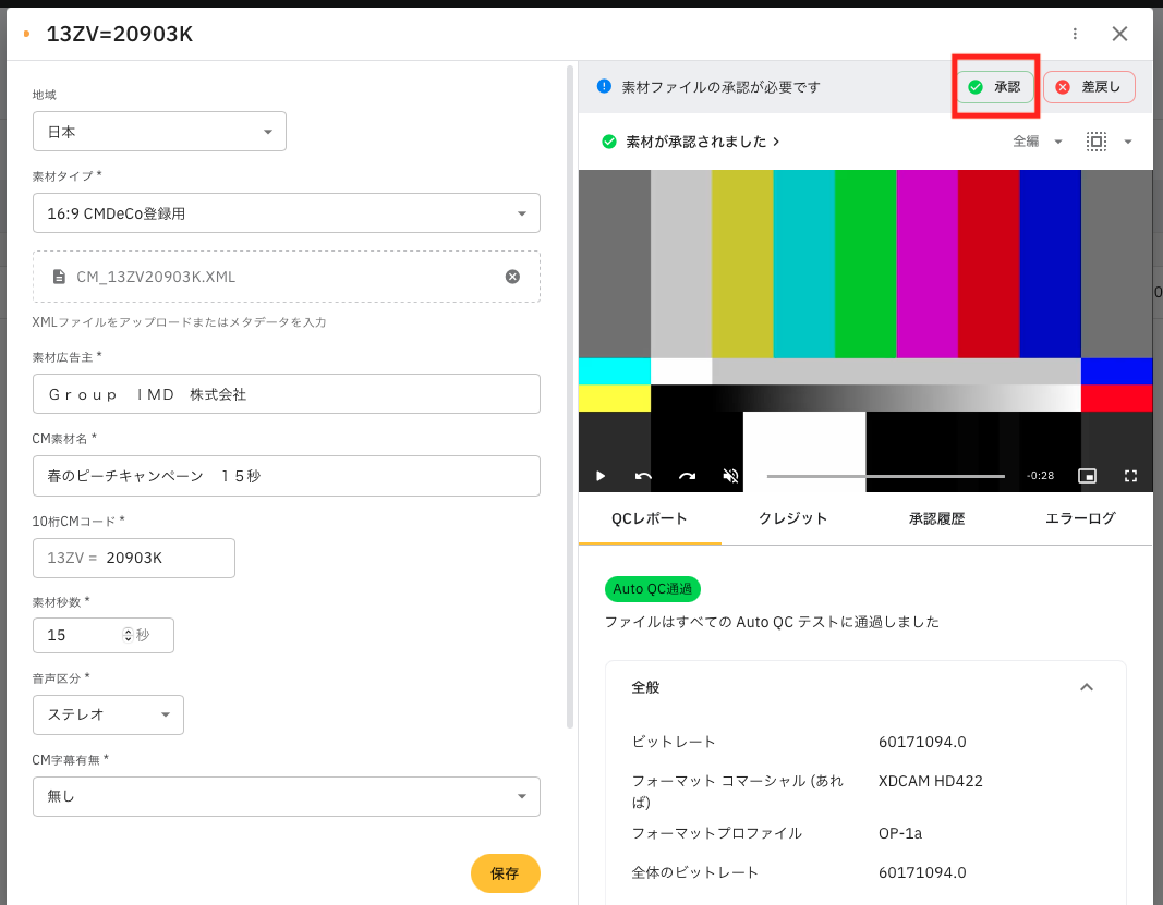 素材確認画面内の映像、および映像内クレジットとメタデータの内容をご確認ください