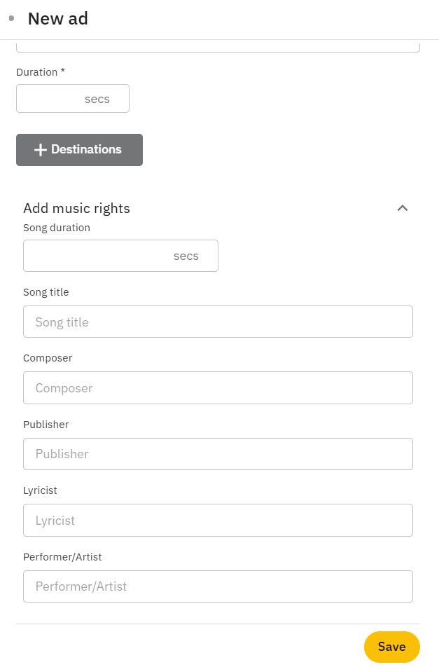 Selecione a região para a qual você está entregando e, no formulário de informações do spot, você encontrará um campo de direitos autorais de música. As informações exatas exigidas podem variar de região para região, mas as informações mais comuns que você precisará fornecer são: